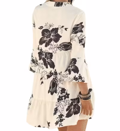 Dank der Ärmel mit Volantabschluss und des tiefen V-Ausschnitts wirkt die Freizeitbluse sehr feminin. Ein schönes Allovermuster macht auch die Rückseite zu einem Blickfang. Das Rockteil der Damenbluse ist in leichter A-Linie gearbeitet und umspielt angenehm die Figur.